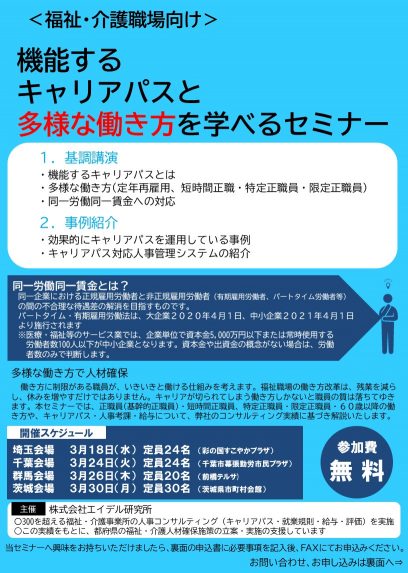 ★開催延期★ 令和2年 エイデル研究所 「機能するキャリアパスと多様な働き方を学べるセミナー」(千葉・群馬・茨城会場)開催のお知らせ